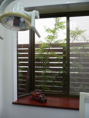 診療室の外には、塀と庭を配して、外には木々を植えています。